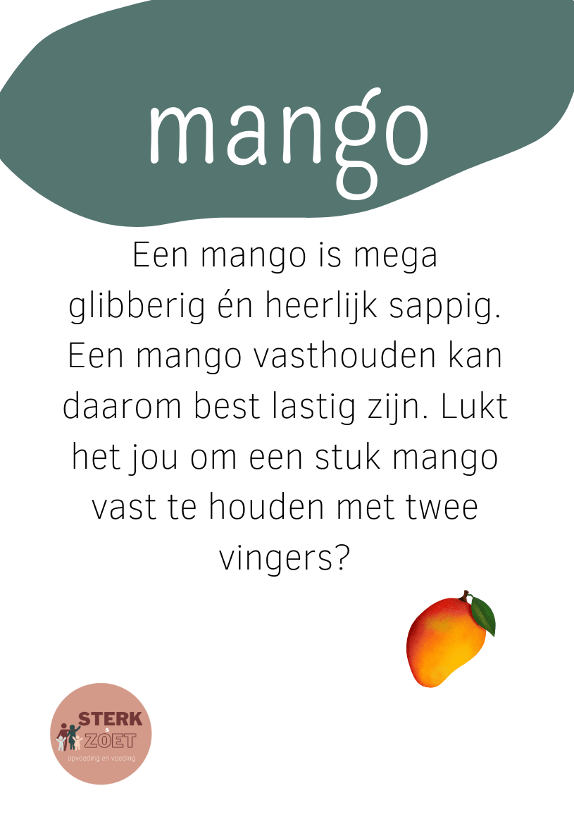 Een kind leert spelenderwijs het allerbeste. Probeer bijvoorbeeld eens dit spelletje uit; Een druif heeft een stevige buitenkant, als je een druif doorbijt hoor je een ‘knak’. Een knakdruif! Wat denk jij? Maakt een grote druif of een kleine druif het hardste ‘knakgeluid’?’. Dit kaartje is een groot succes bij kinderen, ze worden vanuit de opdracht nieuwsgierig naar de druif, waarbij de kans groter is dat er geproefd wordt.